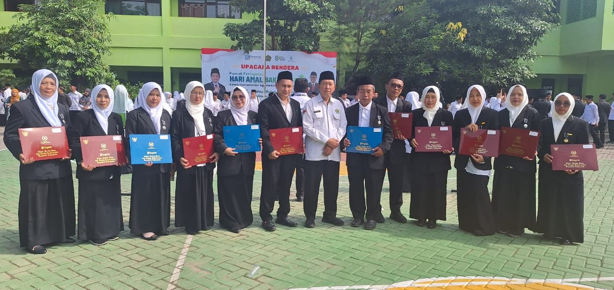 Acara penganugerahan berlangsung khidmat dan dihadiri oleh para kepala madrasah, pejabat Kemenag, serta peserta upacara HAB. Suasana penghormatan terlihat kuat, terutama ketika para penerima dipanggil maju satu per satu untuk menerima medali dan piagam penghargaan di hadapan seluruh tamu undangan.
