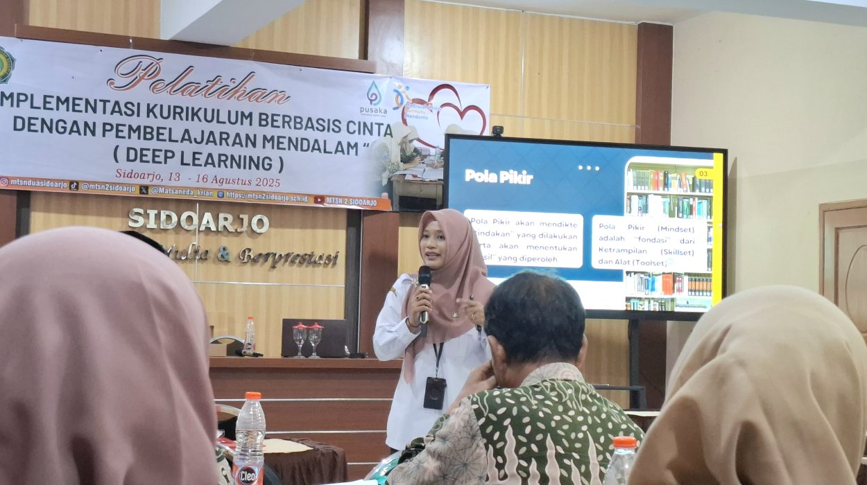 Sidoarjo, 14 Agustus 2025 – MTsN 2 Sidoarjo kembali membuktikan komitmennya dalam penyesuaian kualitas pendidikan melalui pelatihan “Pembelajaran Berbasis Cinta (Deep Learning) dengan Pembelajaran Mendalam” yang berlangsung selama dua hari, 13–14 Agustus 2025, di aula mini madrasah. Pelatihan ini menghadirkan narasumber berpengalaman, Fithriyah Mulyasari, M.Pd., Kepala Sekolah SD Negeri Klurak, Kecamatan Candi, Kabupaten Sidoarjo, yang telah lama berkecimpung di dunia pendidikan mulai dari Malang di SD Internasional, Pasuruan, hingga menjadi Kepala Sekolah sejak 2011. Sejak tahun 2011, beliau mulai berdinas di Dinas Pendidikan kabupaten Sidoarjo.