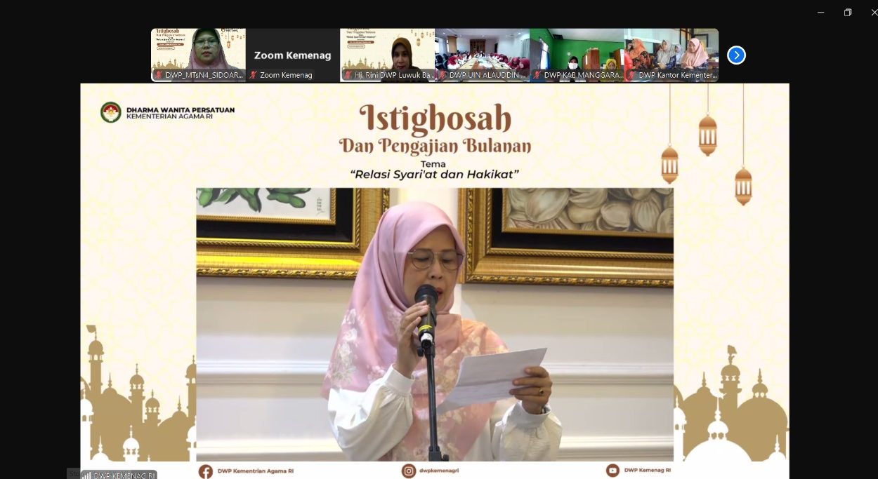 MTs Negeri 4 Sidoarjo_Hari ini, Kamis, 8 Agustus 2024, DWP MTs Negeri 4 Sidoarjo berpartisipasi dalam kegiatan DWP Kementerian Agama RI yang diadakan berupa Istighosah dan Pengajian Bulanan. Acara ini bertema “Relasi Syariat dan Hakikat” yang disampaikan oleh Dr. KH. Akhmad Shodiq, MA melalui zoom meeting. Kegiatan dimulai pada pukul 08.00 WIB dan berlangsung hingga selesai.