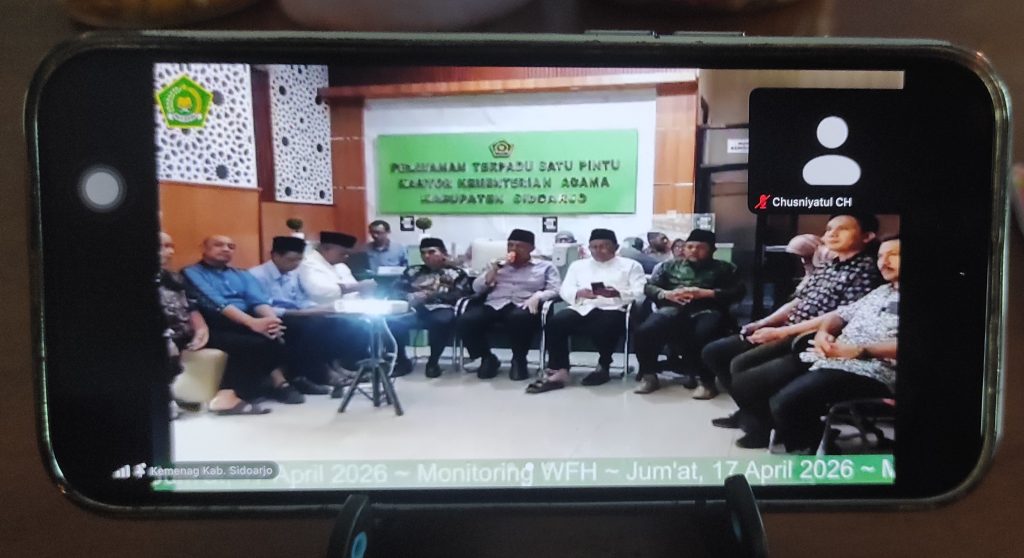 Kantor Kementerian Agama (Kemenag) Kabupaten Sidoarjo menggelar pertemuan virtual melalui aplikasi Zoom pada Jumat (17/4), guna memantau produktivitas pegawai yang tengah menjalankan tugas kedinasan di rumah atau Work From Home (WFH).