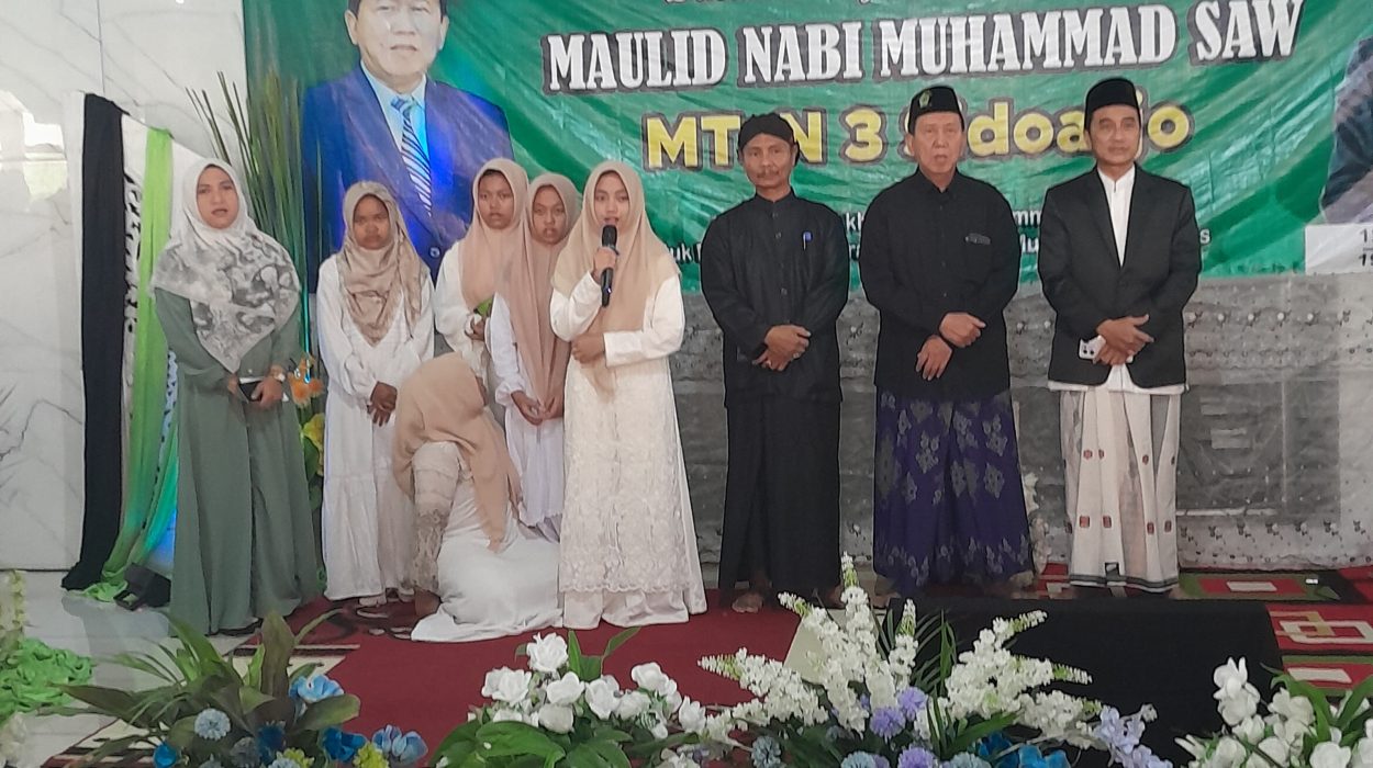 MTs Negeri 3 Sidoarjo – MTs Negeri 3 Sidoarjo menggelar peringatan Maulid Nabi Muhammad SAW 1447 H/12 Rabiul Awal pada Jumat, 12 September 2025. Dengan mengusung tema “Ekoteologi: Keteladanan Nabi Muhammad SAW untuk Kelestarian Bumi dan Negeri”, kegiatan ini berlangsung khidmat di Masjid Baitul Hidayah MTsN 3 Sidoarjo.