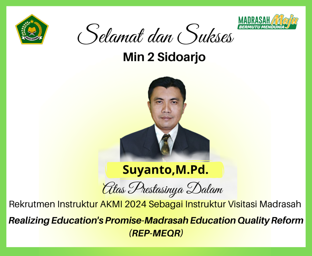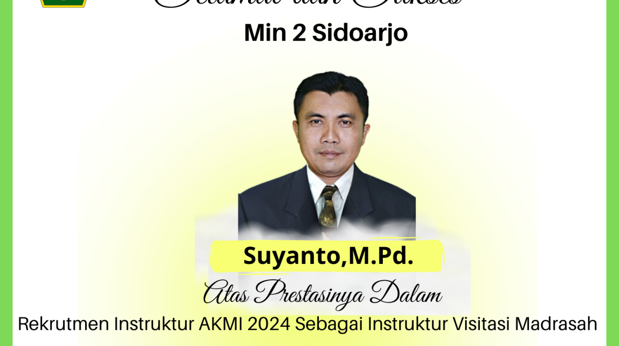 MI Negeri 2 sidoarjo – Guru dari MIN 2 Sidoarjo baru-baru ini berhasil lolos dalam rekruitmen Instruktur AKMI (Asesmen Kompetensi Madrasah Indonesia) 2024 sebagai instruktur visitasi madrasah. Ia Adalah Suyanto, M.Pd. sehari hari sebagai Guru kelas 5B. Di tahun yang Sama, Ia juga lolos menjadi penulis Soal AKMI 2024 Numerasi MI. Keberhasilan ini menandai pencapaian penting bagi madrasah dan menjadi kebanggaan bagi MIN 2 Sidoarjo terlebih lagi Kementerian Agama Kabupaten Sidoarjo.