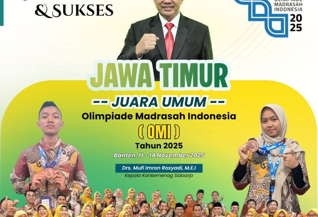 Sidoarjo — Prestasi membanggakan kembali ditorehkan siswa-siswi madrasah Kabupaten Sidoarjo dalam ajang Olimpiade Madrasah Indonesia (OMI) 2025 yang berlangsung di Banten pada 11–14 November 2025. Jawa Timur resmi dinobatkan sebagai Juara Umum Nasional, dan Sidoarjo turut berkontribusi dengan meraih dua medali perunggu pada bidang sains madrasah.