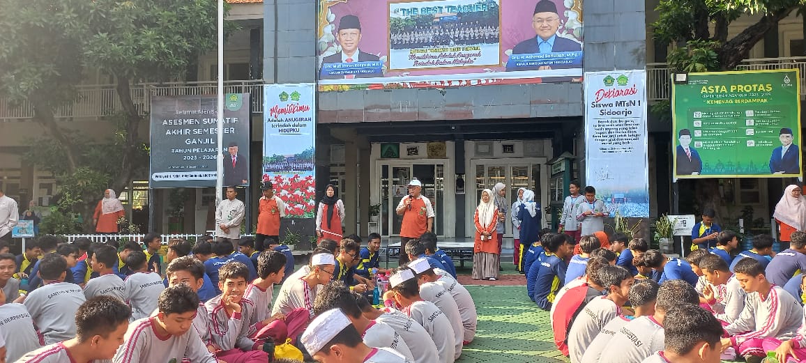 MTsN 1 Sidoarjo – Jumat (5/12/2025) pagi suasana di halaman MTsN 1 Sidoarjo terasa lebih hangat dari biasanya. Usai melewati rangkaian Asesmen Sumatif Akhir Semester dan Remedi, seluruh warga madrasah; Kepala Madrasah beserta staf, ibu KTU dan jajarannya, para guru, serta siswa-siswi MTsN 1 Sidoarjo berkumpul di halaman utama untuk mengikuti acara makan bersama.