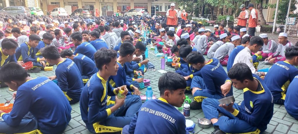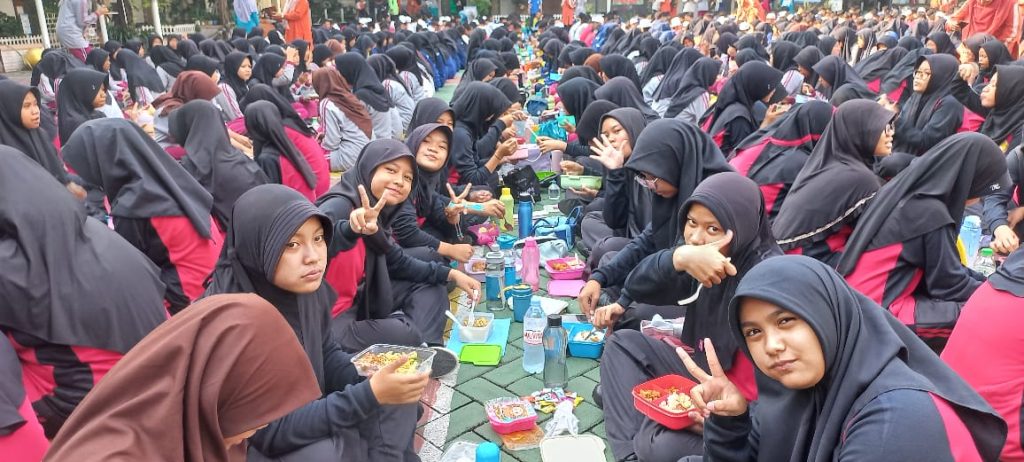 Setelah sambutan, seorang siswa memimpin doa makan. Suasana menjadi hening sejenak, penuh khidmat, sebelum kemudian pecah oleh keceriaan para siswa yang mulai menikmati bekal masing-masing. Mereka duduk bersila, berbagi lauk, bertukar cerita, dan saling menguatkan setelah masa ujian yang cukup melelahkan.