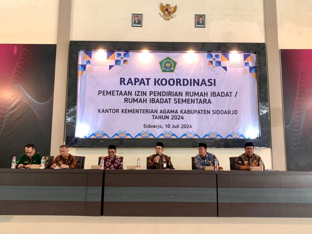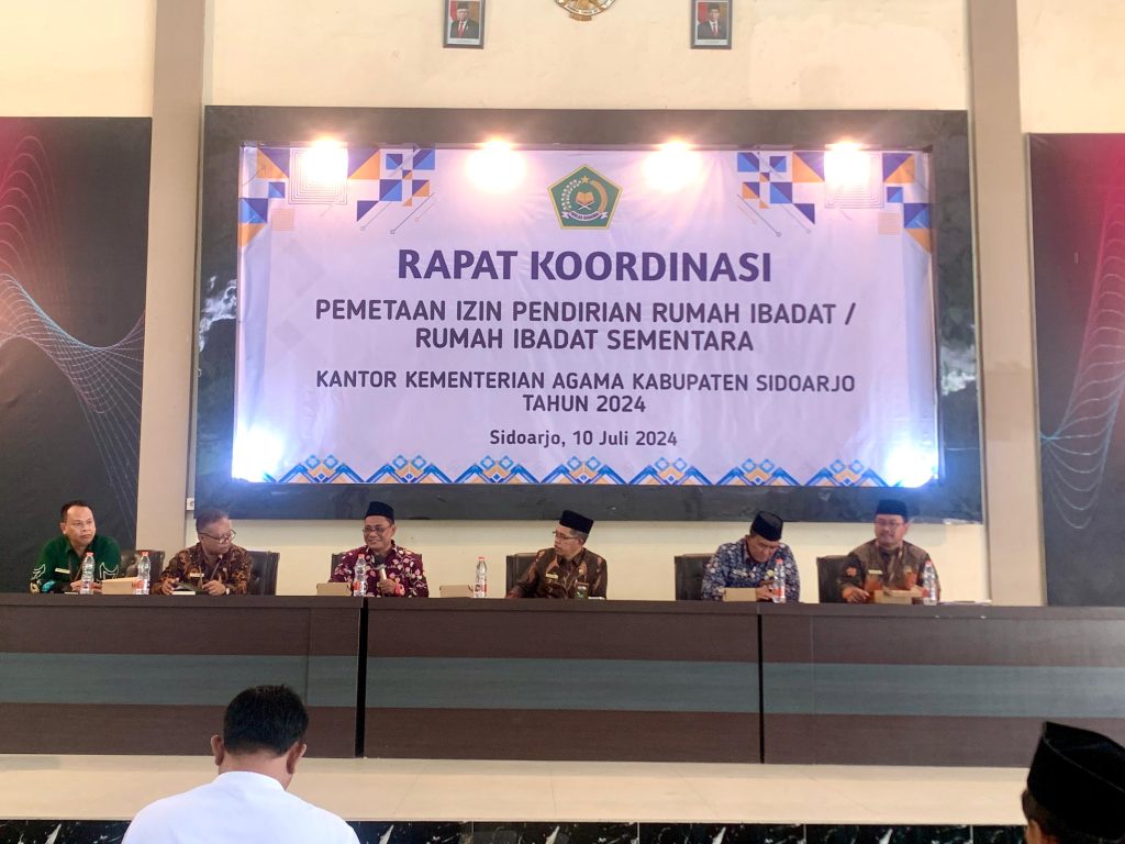 Kepala Kantor Kementerian Agama Kabupaten Sidoarjo Moh. Arwani dalam sambutannya mengungkapkan bahwa rapat ini didasari oleh surat dari Kanwil Kemenag Provinsi Jawa Timur yang mengamanatkan pemetaan izin pendirian rumah ibadat, terutama yang mengalami kendala dalam perizinan dan memerlukan advokasi atau pendampingan. Beliau menekankan pentingnya koordinasi dengan perangkat desa, tokoh agama, dan tokoh masyarakat di setiap kecamatan untuk memberikan pendampingan yang dibutuhkan terhadap rumah ibadat.