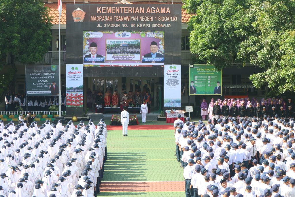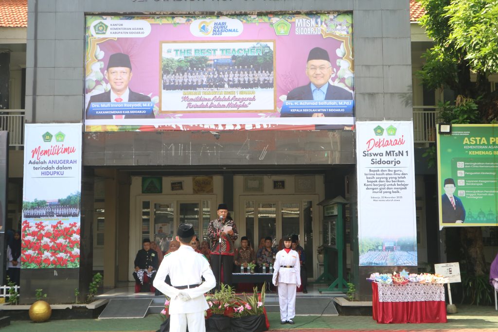 Pada kesempatan tersebut, Kepala Kantor Kemenag Kabupaten Sidoarjo, Drs. Mufi Imron Rosyadi, M.E.I., bertindak sebagai Pembina Upacara serta menyampaikan amanat yang ditujukan kepada seluruh pendidik di lingkungan Kementerian Agama.