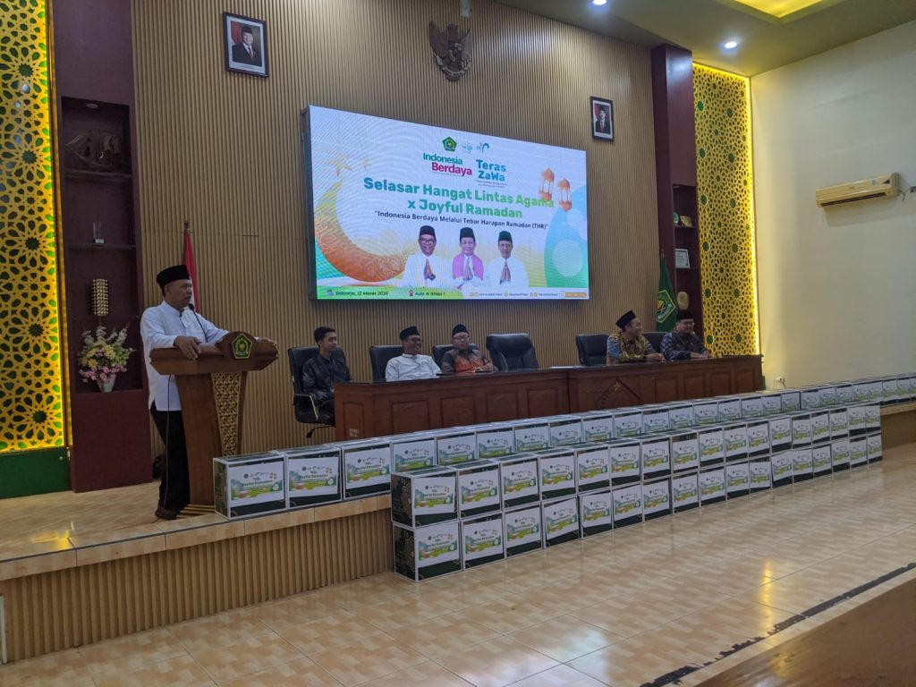 Sidoarjo — Kantor Kementerian Agama Kabupaten Sidoarjo menyalurkan ratusan paket bingkisan kepada masyarakat melalui kegiatan berbagi yang dilaksanakan di Aula Al Ikhlas 1 Kemenag Sidoarjo, Kamis (12/3/2026). Kegiatan ini merupakan bagian dari program nasional bertajuk “Joyful Ramadhan; Indonesia Berdaya melalui Tebar Harapan Ramadhan (THR)” yang digelar serentak di berbagai daerah di Indonesia.