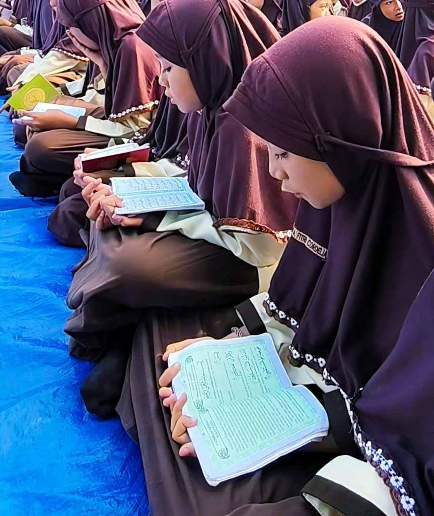 Keindahan pemandangan pagi ini semakin lengkap dengan kehadiran seluruh guru dan staf karyawan yang turut membaur di tengah-tengah siswa. Tanpa sekat, mereka melantunkan ayat-ayat suci Al-Qur’an dengan penuh penghayatan.
