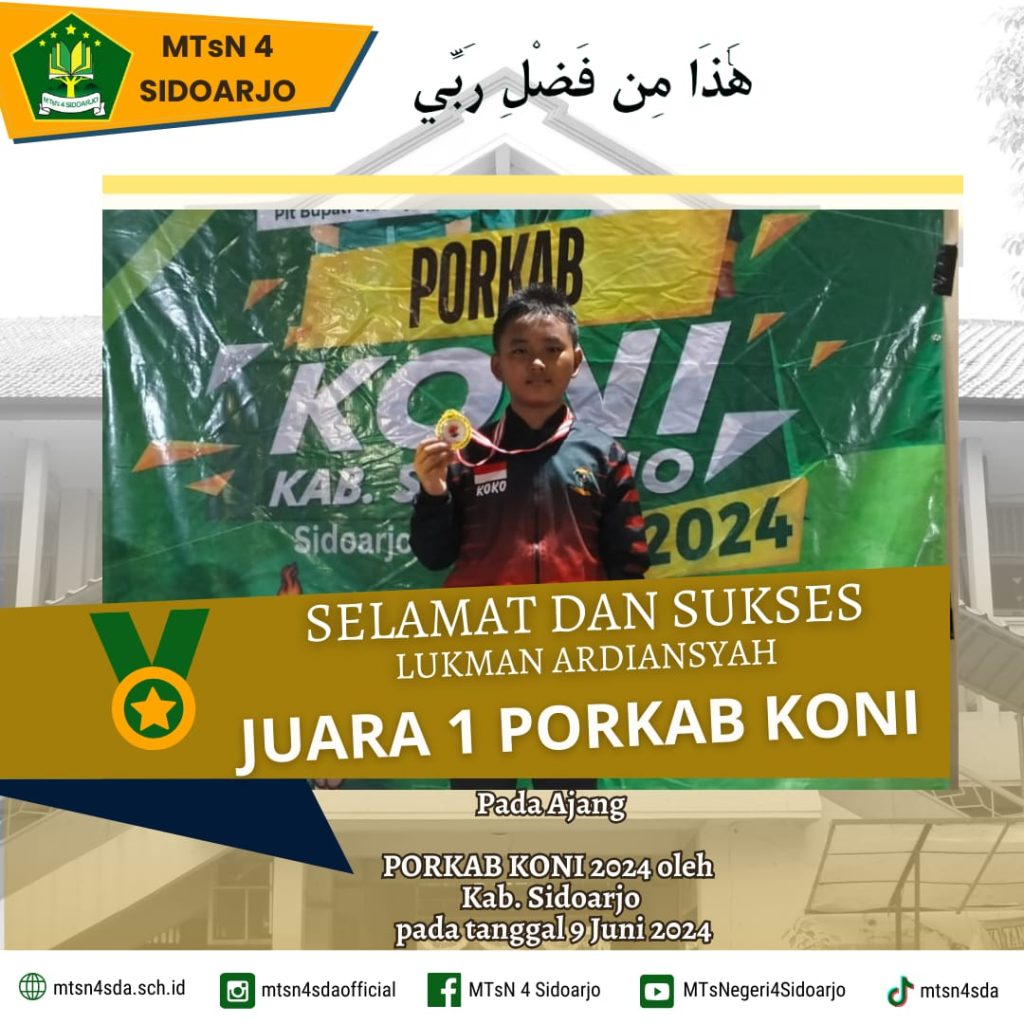 Sidoarjo, 9 Juni 2024 – Prestasi membanggakan kembali ditorehkan oleh Lukman Ardiansyah, siswa Madrasah Tsanawiyah Negeri 4 Sidoarjo. Lukman berhasil meraih Juara 1 dalam ajang Pekan Olahraga Kabupaten (PORKAB) KONI 2024 yang diadakan di Kabupaten Sidoarjo.