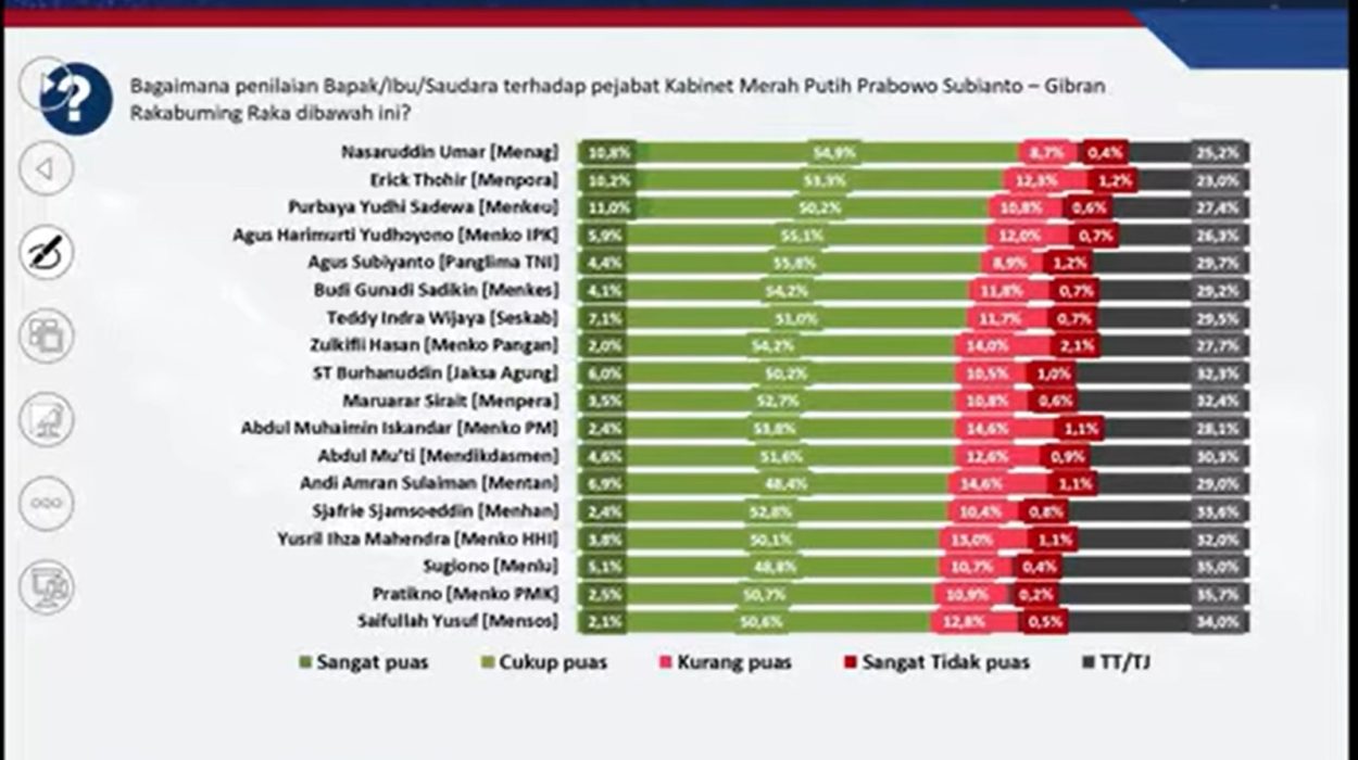 Tingkat kepuasan ini ini merupakan gabuangan dari penilaian publik yang mengaku sangat puas dan cukup puas. Jika dilihat dari sisi penilaian publik yang sangat memuaskan pada kinerja Menteri, maka pada nomor satu ada Menteri Keuangan Purbaya Yudhi Sadewa (11%), Menteri Agama Nasaruddin Umar (10,8%), dan Menpora Erick Thohir (10,2%).