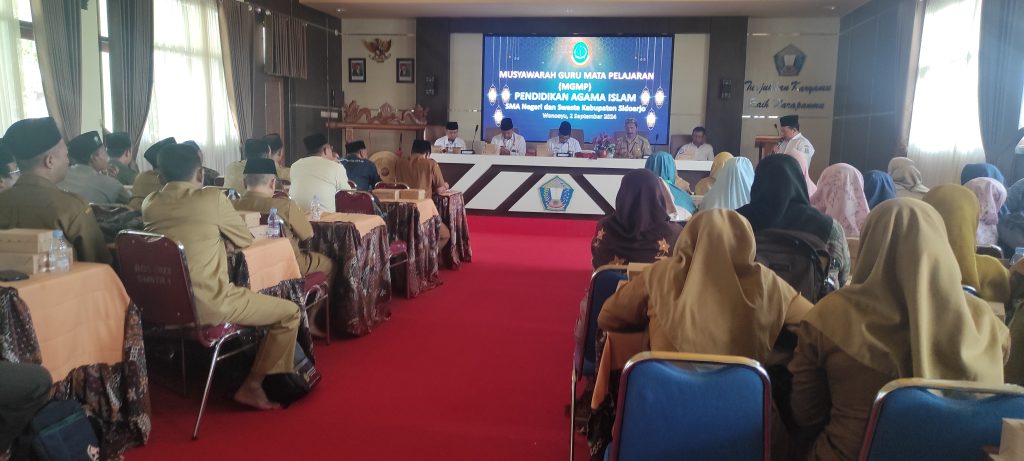 Sidoarjo (Humas) – MGMP (Musyawarah Guru Mata Pelajaran) Pendidikan Agama Islam di Sekolah Umum tingkat SMA se Sidoarjo Senin 2/9 /2024 telah menggelar pertemuan yang di hadiri oleh Kepala Kantor Kementerian Agama Dr. Moh Arwani, M.Ag ,M.HI. Kepala Seksi Pendidikan Agama Islam Imam Mukozali, MM. Dr. Taufik Churrahman dan M. Rokip selaku Pengawas juga sejumlah 50 orang guru PAI peserta musyawarah, bertempat di SMAN Wonoayu Sidoarjo.