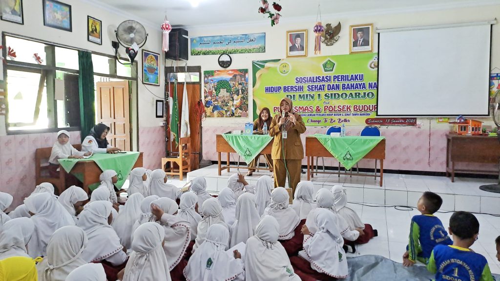 Meningkatnya kasus penyakit akibat gaya hidup tidak sehat dan ancaman bahaya narkoba yang semakin dekat dengan lingkungan sekolah menjadi perhatian serius. Menanggapi hal ini, MIN 1 Sidoarjo secara proaktif menggelar sosialisasi perilaku hidup bersih dan sehat (PHBS) serta bahaya narkoba. Kegiatan yang bekerja sama dengan Puskesmas dan Polsek Buduran ini dilaksanakan pada hari Senin, 13 Januari 2025.