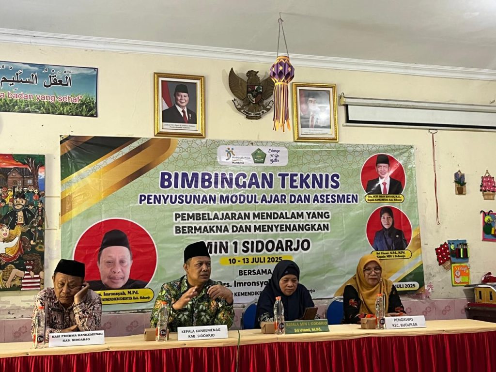 Sidoarjo, 10 Juli 2025 – Madrasah Ibtidaiyah Negeri (MIN) 1 Sidoarjo menyelenggarakan Bimbingan Teknis (Bimtek) Penyusunan Modul Ajar dan Asesmen dengan fokus pada pembelajaran mendalam yang bermakna dan menyenangkan. Acara yang berlangsung dari tanggal 10 hingga 13 Juli 2025 ini diikuti oleh 32 peserta guru MIN 1 Sidoarjo dan menghadirkan narasumber Drs. Imronsyah, M.Pd.