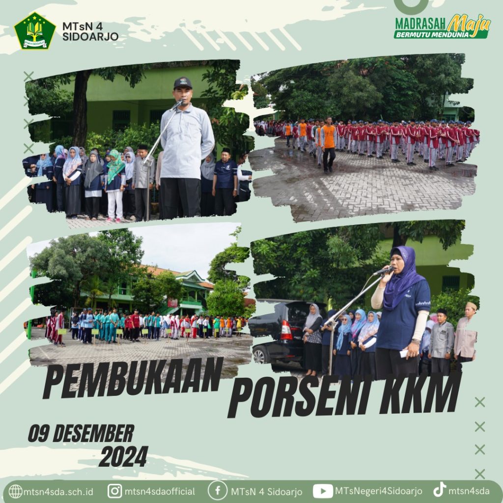 MTs Negeri 4 Sidoarjo_MTs Negeri 4 Sidoarjo kembali menjadi tuan rumah Pekan Olahraga dan Seni (PORSENI) tingkat KKM yang diselenggarakan selama lima hari, mulai tanggal 9 hingga 13 Desember 2024. Kegiatan ini diikuti oleh 12 MTs di bawah KKM MTs Negeri 4 Sidoarjo, yang menghadirkan semangat kompetisi dan kreativitas dari para siswa di berbagai cabang olahraga dan seni.