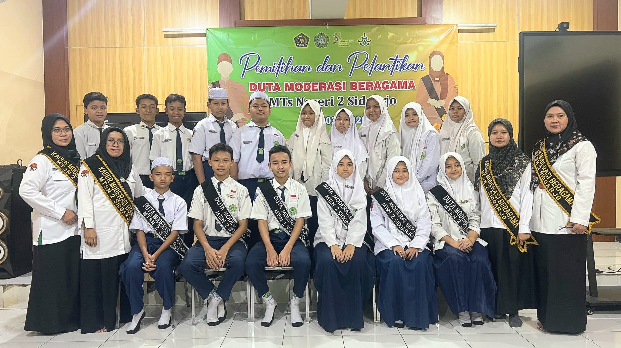 Para Juara Duta Moderasi Beragama 2025 setelah melewati persaingan yang ketat, dewan juri akhirnya memutuskan para pemenang yang berhak menyandang gelar Duta Moderasi Beragama MTsN 2 Sidoarjo tahun ini. Mereka adalah: * Juara 1: Alifia (kelas 8A)-Fahri (kelas 8A) * Juara 2: Mahendra (kelas 8C)-Ayana Bintang (kelas 7C) * Juara 3: Darka (kelas 7C)-Keysa Adelia (kelas 9A)Komitmen Kemenag dalam Moderasi Beragama.