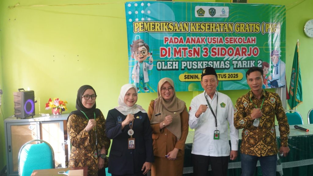 Sidoarjo (MTsN 3) — MTsN 3 Sidoarjo pada Senin (11/08/2025) menjadi tuan rumah kegiatan skrining kesehatan gratis yang diinisiasi oleh Dinas Kesehatan Kabupaten Sidoarjo bekerja sama dengan Puskesmas Tarik 2. Kegiatan yang berlangsung di ruang pertemuan lama mulai pukul 08.00 hingga 11.00 WIB ini menyasar siswa kelas 7 baru sebagai sampel pemeriksaan.