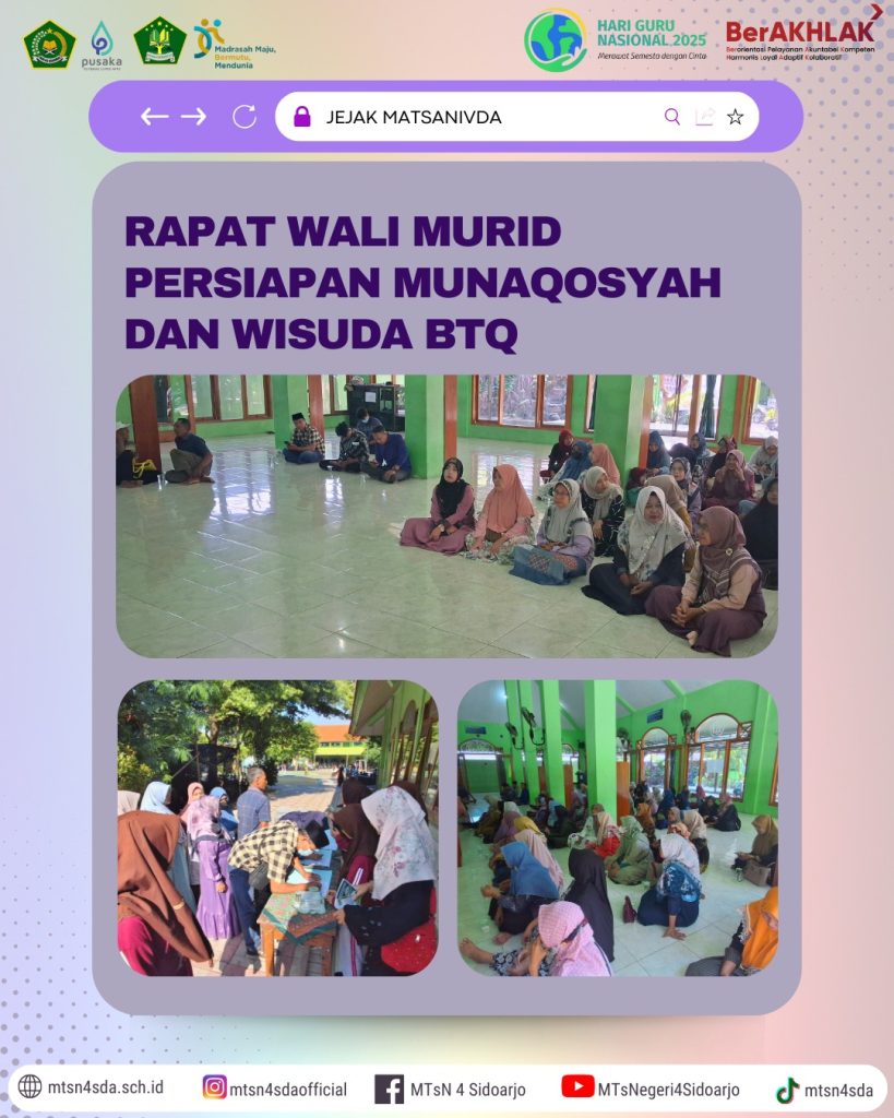 Sidoarjo – MTsN 4 Sidoarjo menggelar rapat wali murid dalam rangka persiapan pelaksanaan munaqosyah dan wisuda Baca Tulis Al-Qur’an (BTQ), pada Jumat, 30 Januari 2026. Kegiatan ini diikuti oleh para wali murid siswa kelas 7, 8, dan 9 yang putra putrinya akan mengikuti munaqosyah tingkat marhalah