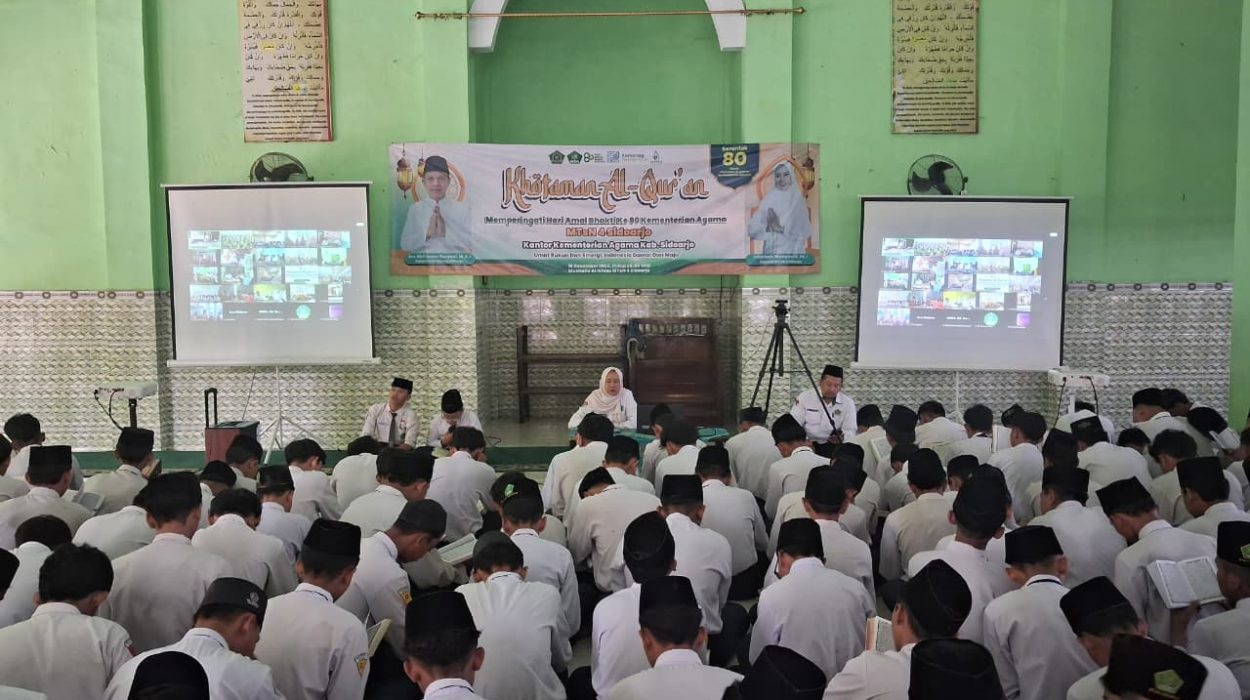 Dalam rangka memperingati Hari Amal Bakti (HAB) Kementerian Agama Republik Indonesia, MTsN 4 Sidoarjo turut berpartisipasi dalam kegiatan Khotmil Qur’an serentak 80 majelis yang dilaksanakan pada Selasa, 16 Desember 2025. Kegiatan ini merupakan bagian dari ikhtiar spiritual Kementerian Agama untuk memperkuat nilai-nilai religius sekaligus menumbuhkan kecintaan terhadap Al-Qur’an di lingkungan madrasah.