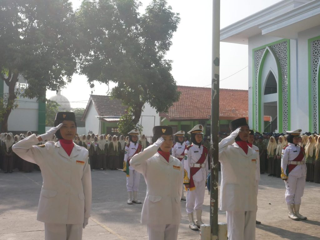 - Pengurus OSIM MTs Negeri 2 Sidoarjo masa bakti 2024/2025 meninggalkan tempat upacara.