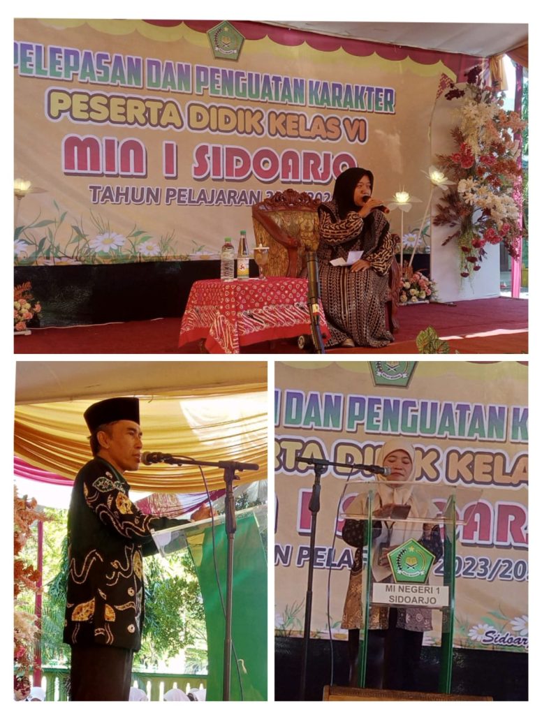 Kasi Pendma, Bapak Ahmad Fathoni mengucapkan selamat kepada 122 siswa-siswi kelas VI MIN 1 Sidoarjo. “Walaupun kalian sudah lulus tetap muliakan dan hormati gurumu, mendahului mengucapkan salam ketika bertemu dan sebagai siswa sebelum belajar ilmu yang lain harus belajar adab terlebih dahulu, karena kepintaran seseorang tidak akan bernilai apabila tidak mempunyai adab/etika.” tutur beliau penuh nasehat.