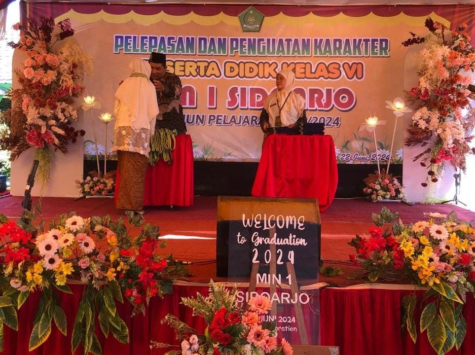 MIN 1 Sidoarjo – MIN 1 Sidoarjo menyelenggarakan wisuda sekaligus pelepasan siswa kelas VI dengan menyerahkan kembali 122 siswa kepada orang tua masing-masing. Pelaksanaan wisuda dan pelepasan siswa kelas VI bertempat di halaman madrasah pada tanggal 22 Juni 2024. Acara ini diikuti oleh siswa kelas VI beserta wali siswa, guru dan karyawan MIN 1 Sidoarjo, serta tamu undangan yang terdiri dari Kasi Pendma Kantor Kementerian Agama Kab. Sidoarjo, Pengawas Madrasah Kec. Buduran, Kepala Desa Banjarkemantren dan Komite Madrasah.