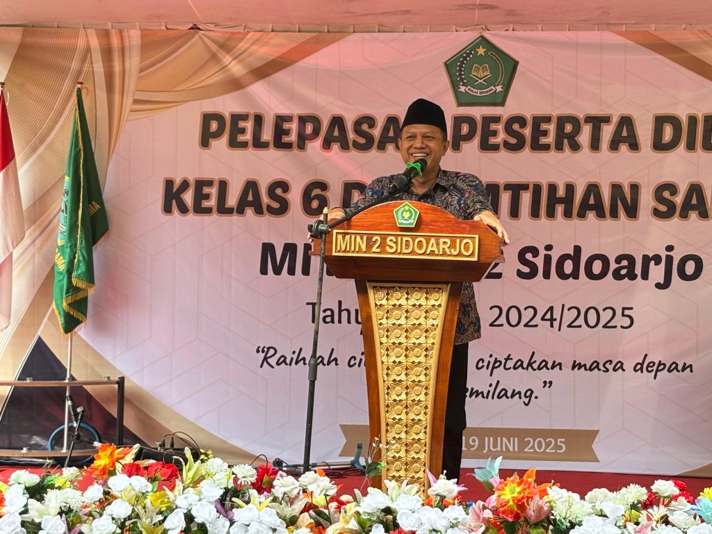 Sidoarjo, 19 Juni 2025 – Suasana haru dan penuh semangat menyelimuti halaman Madrasah Ibtidaiyah Negeri (MIN) 2 Sidoarjo saat digelar acara pelepasan peserta didik kelas VI pada Kamis (19/6). Acara tersebut menjadi momentum penting bagi para siswa yang telah menuntaskan pendidikan dasar mereka.