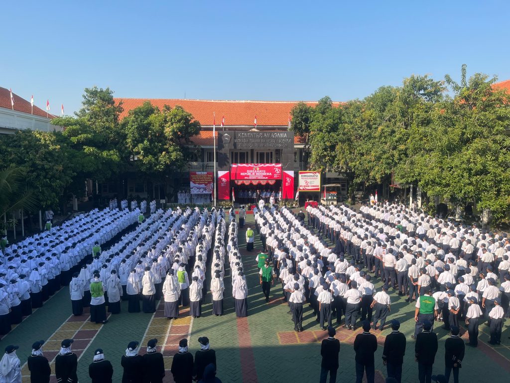 MTs Negeri 1 Sidoarjo – Dalam rangka menyambut Hari Ulang Tahun Ke-79 Kemerdekaan Republik Indonesia, MTsN 1 Sidoarjo menggelar upacara bendera yang diikuti oleh seluruh warga madrasah baik tenaga pendidik maupun tenaga kependidikan di halaman utama pada Sabtu (17/08).