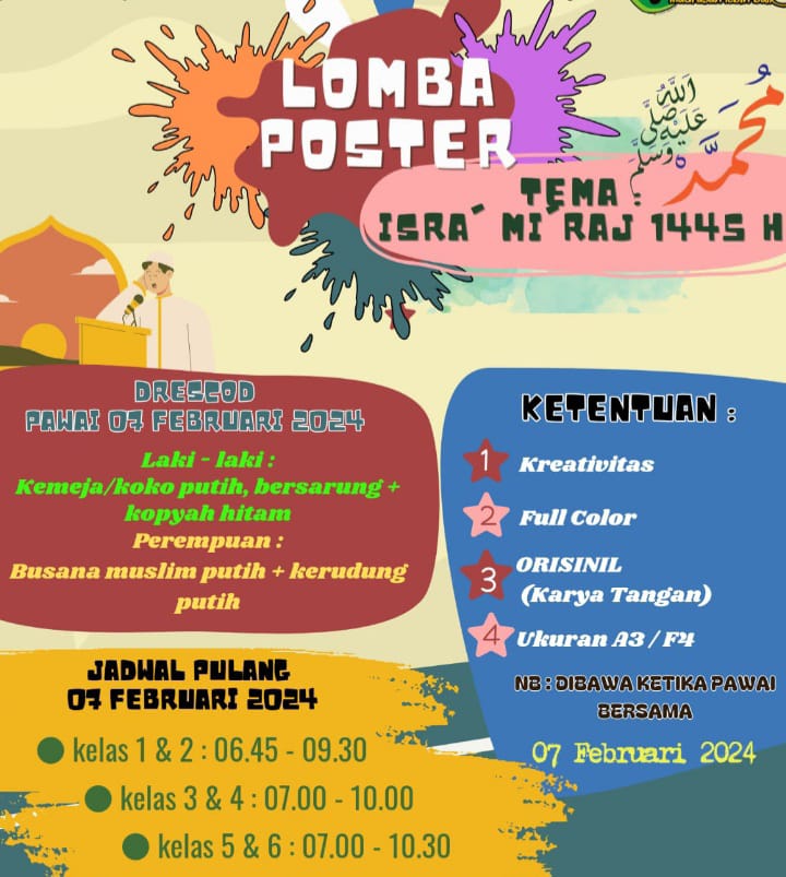 Varian kegiatan yang dilaksanakan antara lain lomba tahfidz, lomba adzan, lomba membuat poster dengan tema Isro’ Mi’roj, Lomba Praktek Sholat, lomba sepeda hias, Lomba mewarnai, Lomba menulis kaligrafi, lomba membaca puisi.