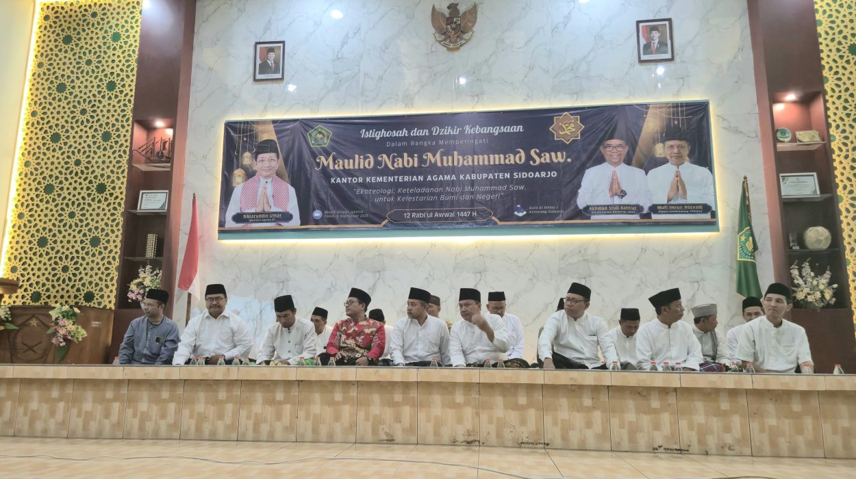 MTs Negeri 2 Sidoarjo – Lantunan shalawat nabi mengawali malam peringatan Maulid Nabi Muhammad SAW yang penuh khidmat di Aula Al Ikhlas 1 Kantor Kementerian Agama Kabupaten Sidoarjo. Acara yang mengusung tema “Istighosah dan Dzikir Kebangsaan” ini menjadi ajang refleksi bagi 150 peserta, yang terdiri dari staf Kemenag, KUA, penyuluh, penghulu, hingga kepala madrasah se-Kabupaten Sidoarjo, termasuk perwakilan dari MTsN 2 Sidoarjo.