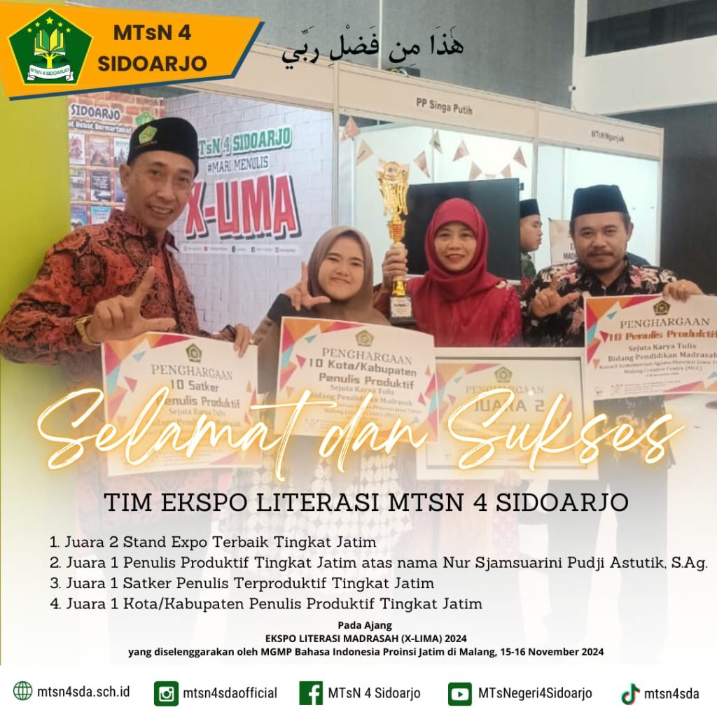 Sidoarjo, 16 November 2024 – MTs Negeri 4 Sidoarjo kembali menorehkan prestasi gemilang dalam ajang Expo Literasi Madrasah (X LIMA 2024) yang berlangsung pada tahun ini. Expo Literasi Madrasah ini diselenggarakan oleh Kantor Wilayah Kementerian Agama Provinsi Jawa Timur bekerja sama dengan MGMP Bahasa Indonesia MTs Provinsi Jawa Timur. Acara ini diselenggarakan dalam rangka bulan bahasa dan bertujuan untuk mendorong kreativitas dan produktivitas literasi di kalangan madrasah. Rangkaian kegiatan Expo Literasi meliputi workshop pengembangan literasi guru bahasa, lomba vlog, guru inovasi, musikalisasi puisi, dan pidato Bahasa Indonesia. Acara puncak berupa Pameran Karya serta penyerahan penghargaan diselenggarakan pada 16 November 2024 di gedung MCC Malang. MTs Negeri 4 Sidoarjo membawa dan memamerkan beberapa karya literasi hasil karya guru maupun siswa.