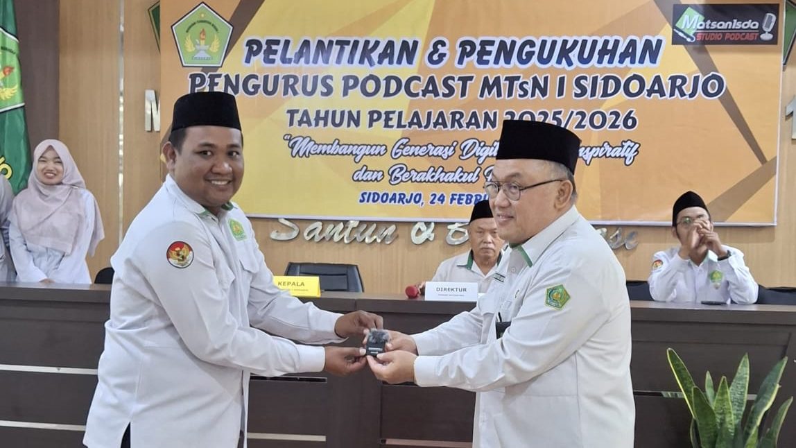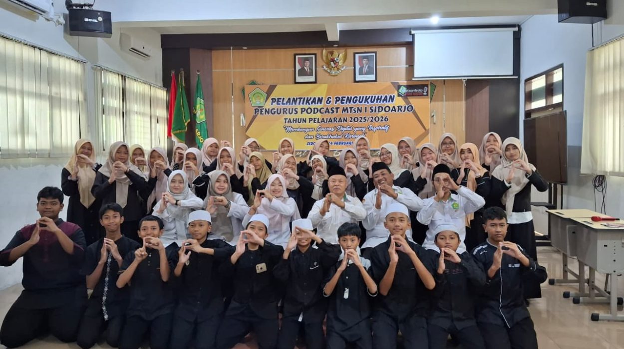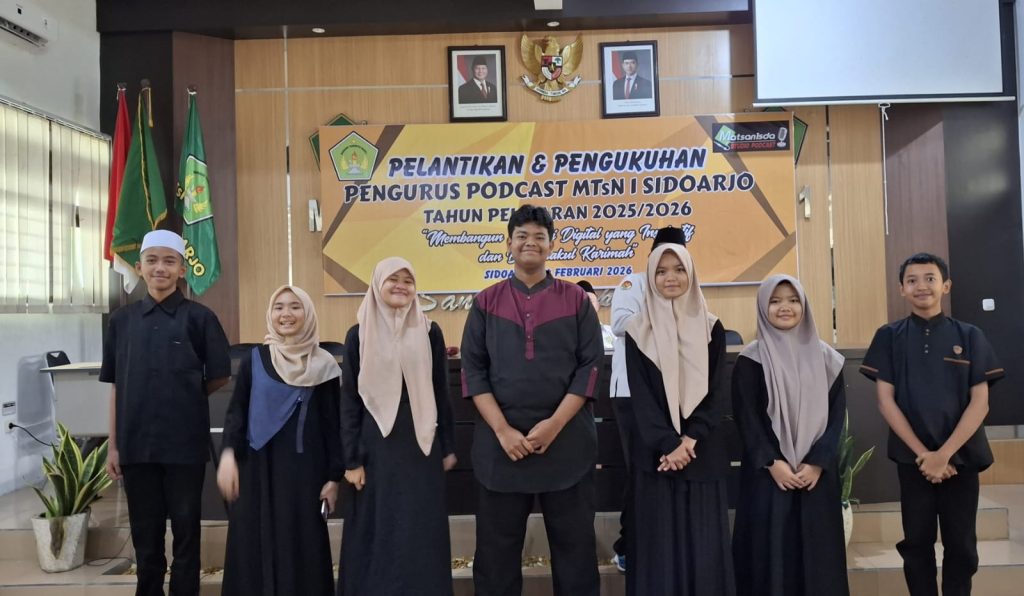 MTsN 1 Sidoarjo – Selasa, 24 Februari 2026 menjadi momentum penting bagi keluarga besar MTsN 1 Sidoarjo. Bertempat di Auditorium Hasan Al-Bashri, pelantikan Pengurus Podcast Matsan1sda Generasi ke-3 berlangsung dengan penuh semangat dan harapan baru. Kegiatan ini dihadiri oleh para pembina, ketua kelas 7, 8, dan 9, serta pengurus OSIM yang turut menjadi saksi lahirnya generasi penerus media kreatif madrasah.