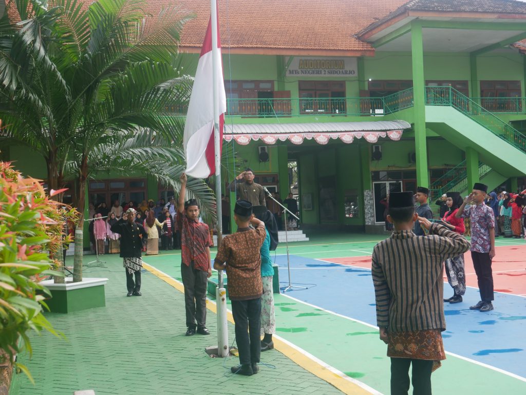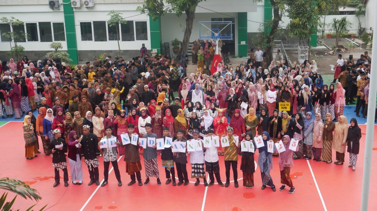 MTs Negeri 2 Sidoarjo – Menyambut semangat peringatan Hari Pendidikan Nasional di MTs Negeri 2 Sidoarjo pada 2 Mei 2025. Sejak pukul 07.00 WIB, lapangan madrasah disulap menjadi panggung keberagaman, tempat seluruh warga madrasah menyatu dalam semangat kebangsaan. Seluruh civitas akademika tampil dalam balutan pakaian adat dari berbagai penjuru Nusantara. Para guru, staf Tata Usaha, serta siswa kelas 7 dan 8 mengenakan busana daerah yang beraneka rupa, memperlihatkan kekayaan budaya Indonesia dalam suasana yang penuh kebersamaan. Bapak Amar Muzaky bertindak sebagai pembina upacara.