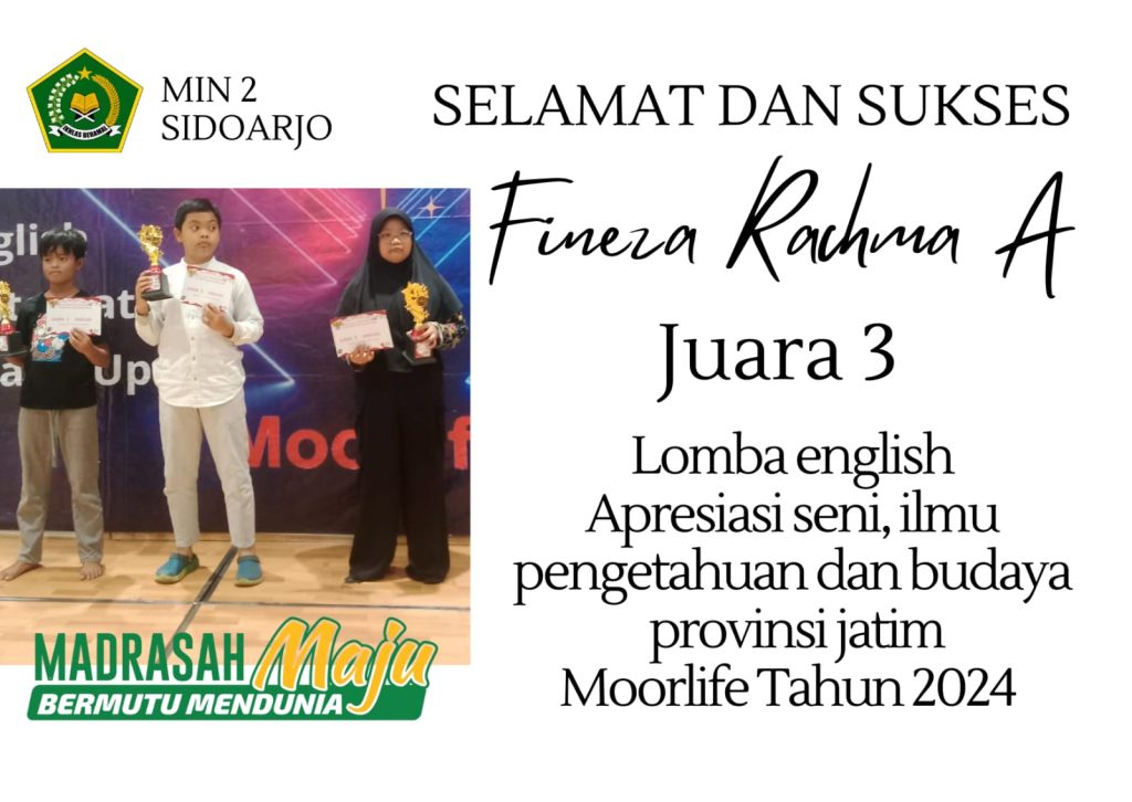 MI Negeri 2 Sidoarjo – Prestasi membanggakan kembali diraih oleh Madrasah Ibtidaiyah Negeri 2 Sidoarjo. Salah satu siswanya, Fanezza Rohmah A, berhasil meraih juara 3 dalam Lomba Bahasa Inggris yang diselenggarakan Moorlife dan Paguyuban Apresiasi seni, Ilmu pengetahuan dan budaya provinsi Jawa Timur. yang diadakan pada tanggal 11 Agustus 2024.