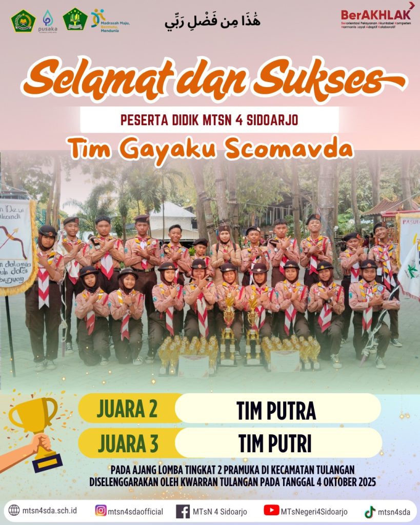 Sidoarjo, 4 Oktober 2025 — Kabar membanggakan datang dari peserta didik MTsN 4 Sidoarjo. Tim Pramuka kebanggaan madrasah yang dikenal dengan nama “Gayaku Scomavda” berhasil menorehkan prestasi gemilang dalam Ajang Lomba Tingkat 2 Pramuka Kecamatan Tulangan yang diselenggarakan oleh Kwarran Tulangan. Dalam kompetisi tersebut, Tim Putra berhasil meraih Juara 2, sementara Tim Putri memperoleh Juara 3.