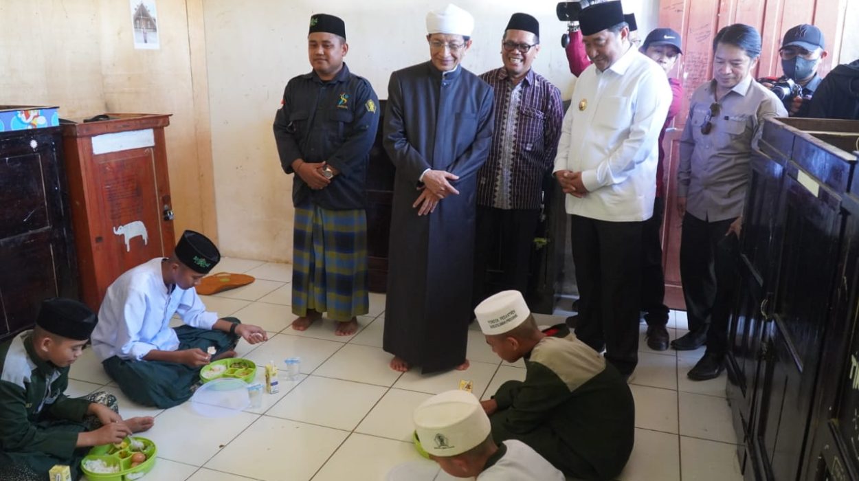 Menteri Agama RI Nasaruddin Umar meninjau pelaksanan simulasi program Makan Bergizi Gratis (MBG) di Pondok Pesantren Nahdlatul Ummat, Polewali Mandar, Sulawesi Barat, Sabtu (30/11/2024). Menag melihat langsung