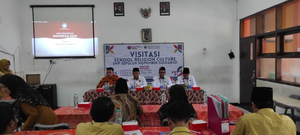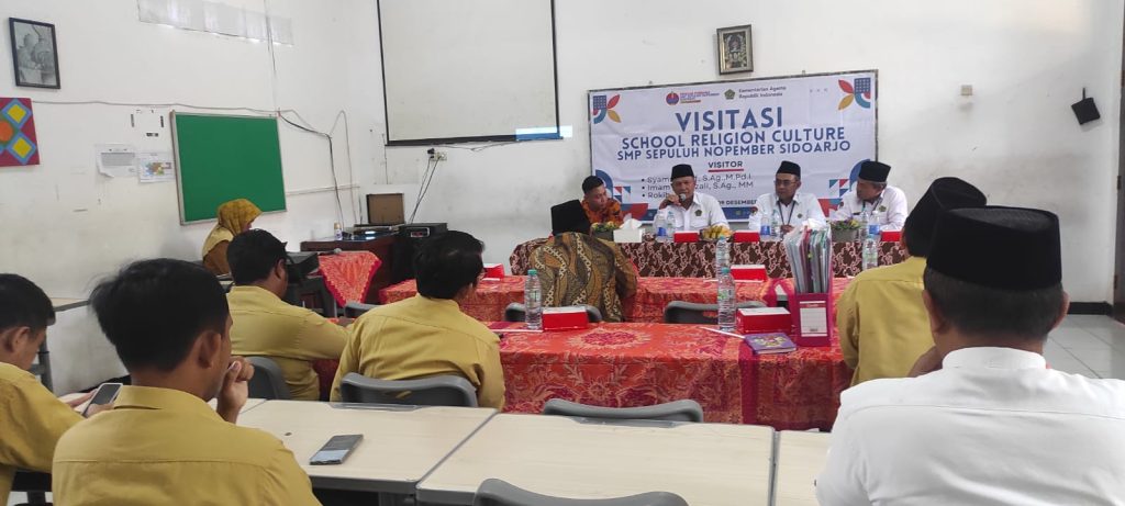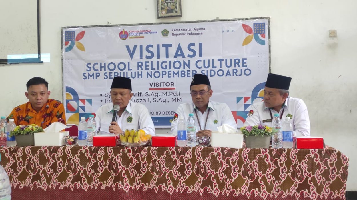 Sidoarjo – Visitasi School Religious Culture di SMP Sepuluh Nopember Sidoarjo dilaksanakan pada Senin, 9 Desember 2024. Acara ini dihadiri oleh Kepala Kantor Kementerian Agama Kabupaten Sidoarjo, Drs. Mufi Imron Rosyidi, M.EI, Kasi PAIS Imam Mukhozali, S.Ag., M.M, tim penilai dari Provinsi Jawa Timur, Kepala SMP Sepuluh Nopember, serta dewan guru. Visitasi ini bertujuan untuk menilai sejauh mana pembiasaan keagamaan yang diterapkan di sekolah umum ini, yang mengedepankan moderasi beragama di tengah keberagaman.