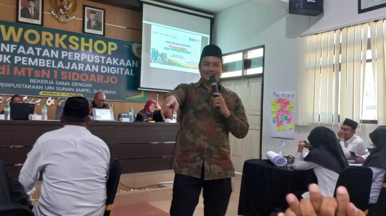 MTs Negeri 1 Sidoarjo– Madrasah Tsanawiyah Negeri 1 Sidoarjo menggelar Workshop bertajuk,”Memanfaatkan Perpustakaan untuk Pembelajaran Digital.” Workshop digelar selama dua hari, pada 16-17 Juli 2024. Kegiatan ini bertujuan untuk mempersiapkan bapak/ibu guru dalam menghadapi era digital seperti saat ini. Bagaimana cara memanfaatkan perpustakaan sebagai sumber belajar yang lebih efektif dengan cara yang inovatif.